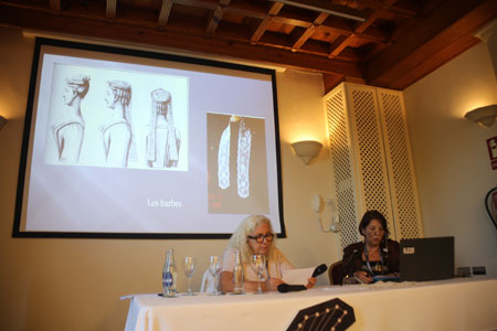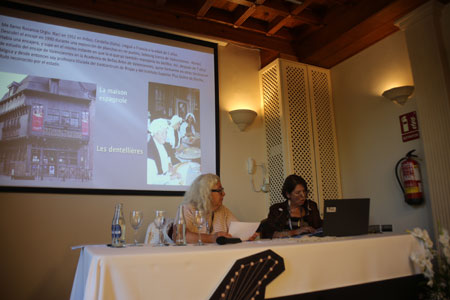 Rosanna était accompagnée de Nathalie, l'interprète. Seules les conférences en Français étaient traduites en espagnol. Il avait été demandé à Rosanna de présenter la dentelle de Valenciennes, sujet qu'elle maitrise parfaitement puisqu'elle a débuté la dentelle avec cette technique en 1990. C'était d'ailleurs des débuts un peu bizarres car habituellement on commence par la dentelle torchon !
