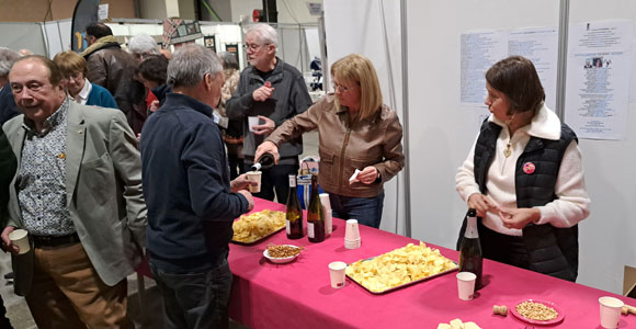 L'inauguration a lieu le vendredi soir. L'apéritif était une dégustation des vins d'Anjou proposée par le domaine de la Ducquerie de Val du Layon avec du blanc sec, du vin moelleux et du vin rouge. Comme la vigneronne était seule, avec Patrick de l'organisation, pour servir Rosanna est passée derrière la table pour servir les exposants assoiffés !