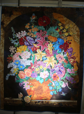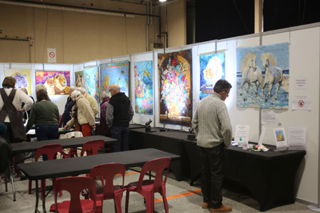 Beaucoup d'artistes en art textile, en quilts en peinture à l'aiguille avaient installé leurs oeuvres dans la salle attenante à la salle principale des commerçants et artisans. En détail de la photo de gauche "L'esprit du vent" Chevaux de Camargue réalisé en quilt.