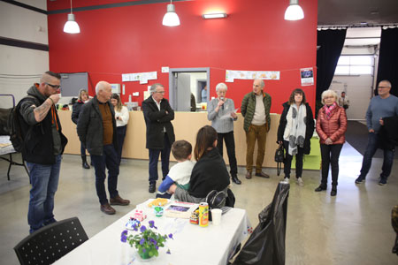 Samedi midi, c'est l'heure de l'inauguration. Bien que ce soit un week-end d'élections, Lucette a pu avoir la grande salle de la Cavalerie. Fernand Burkhalter, maire sortant, a félicité Lucette et son équipe pour ce superbe couvige. Après les discours, le pot de l'amitié fut servi accompagné de diverses mignardises réalisées par les dentellières de l'association.