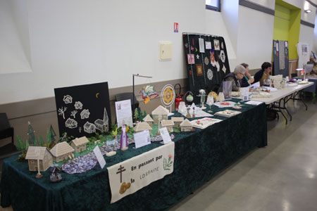 Chantal Becker représente avec ses dentellières "les dentellières de la Nied". Elles viennent de Raville dans la Moselle. Sur leur stand le "Graoully", dragon légendaire qui aurait vécu dans la ville de Metz au IIIème siècle. Toujours sur le patrimoine, un village en dentelle avec la croix de Lorraine. A l'origine, la croix de Lorraine était une relique contenant un objet saint (un morceau de bois de la croix sur laquelle le Christ a été crucifié), elle porte le nom de Croix d'Anjou ou Croix de Jérusalem. Associée aux croisades en Terre sainte, elle figure dans la symbolique des seigneurs chrétiens, en particulier celle des Ducs d'Anjou et de Lorraine. En 1940, elle est peinte sur les avions de la France Libre pour contrer la croix gammée. Pour la troisième fois, la Croix de Lorraine est devenue symbôle de Résistance avec un grand R. Une immense Croix de Lorraine domine la commune de Colombey-les deux-églises où repose le Général de Gaulle.