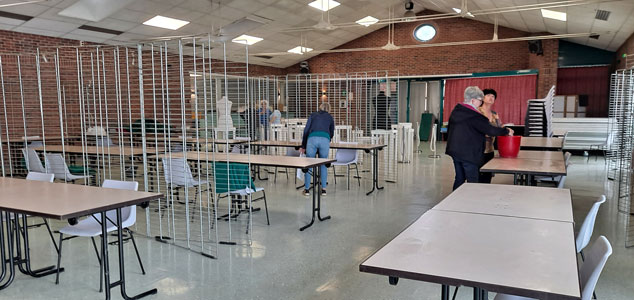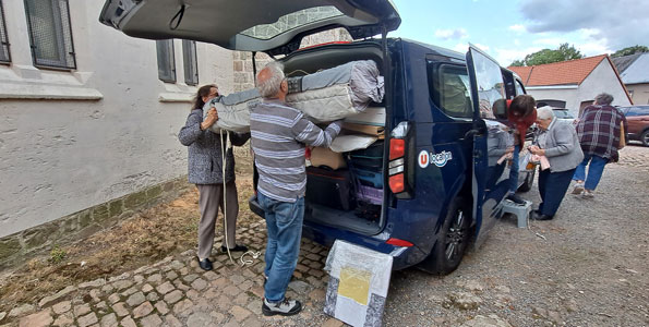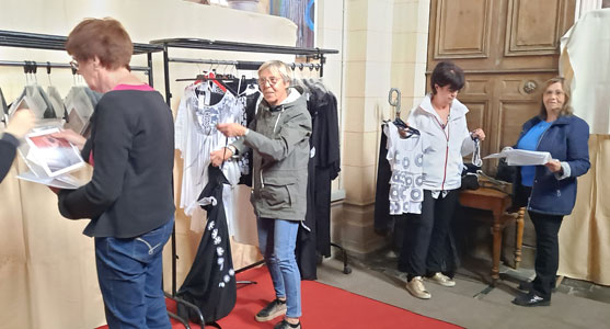 Puis, c'est le moment de prendre les vêtements résidence Perrière pour les installer dans le vestiaire de fortune dans l'église. Grâce à la numérotation et le classement à l'aide de photos, il n'y a pas eu de problème lors du défilé.