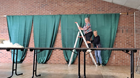 Dès que les hommes ont installé les tables et grilles, les D.S. se chargent des tissus pour les tables des délégations étrangères. Dominique, aidée par Danièle, s'occupent de la scène pour notre invité d'honneur.