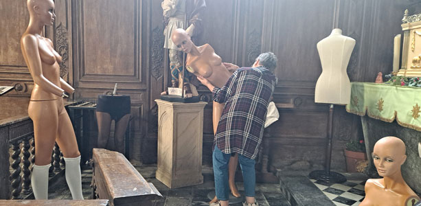 Anne-Marie installe l'exposition de Sabine Leggett, grande collectionneuse, qui nous a généreusement prêté des mannequins et des robes de toute beauté des années 1850/1900.