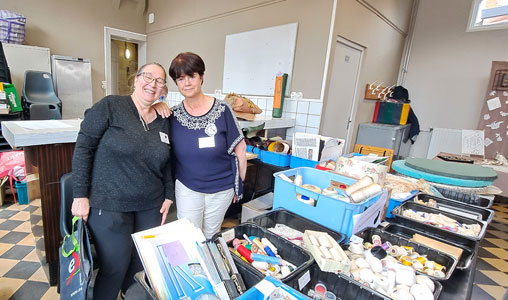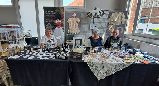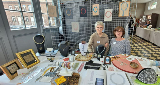 Nous voici à la salle des fêtes rebaptisée cette année salle Renée Hémont. A l'entrée, vous trouviez Nadine et Michèle David, volontaire du groupe de Gembloux, qui tenaient avec brio le stand des puces dentellières. Devant le succès de ce stand, nous ferons une journée dédiée aux puces appelée "Puces au fil des arts". Ce sera le 23 novembre 2025 à la salle polyvalente de Sebourg.