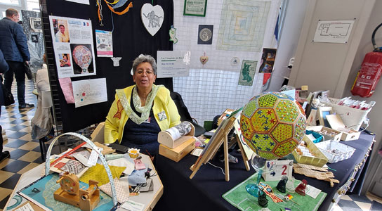 En face du stand des puces, se trouvait Rita. A peine remise d'un gros souci de genoux, elle a tenu à participer pour la première fois à notre biennale. Fervente suportrice de footbal, elle a bien sûr présenté son ballon en dentelle, mais pas que : elle affiche aussi les scores.