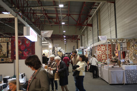 Dans ce salon, il y a quatre allées très larges. Les photos sont prises le dimanche, la seule journée où elles ne sont pas noires de monde. Il y a bien sûr beaucoup de patchwork, mais pas que, on trouvait des stands de fermetures éclair, des machines à coudre, plus perfectionnées les unes que les autres, indispensables pour le patch mais aussi programmables pour la broderie.