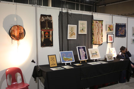 Beaucoup d'artistes en art textile, en quilts en peinture à l'aiguille avaient installé leurs oeuvres dans la salle attenante à la salle principale des commerçants et artisans. En détail de la photo de gauche "L'esprit du vent" Chevaux de Camargue réalisé en quilt.